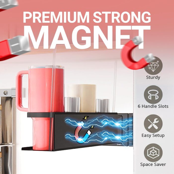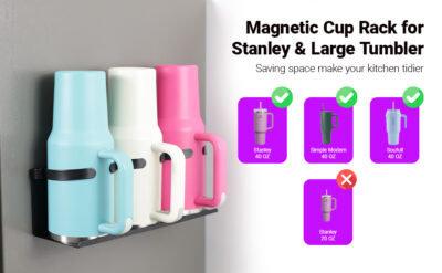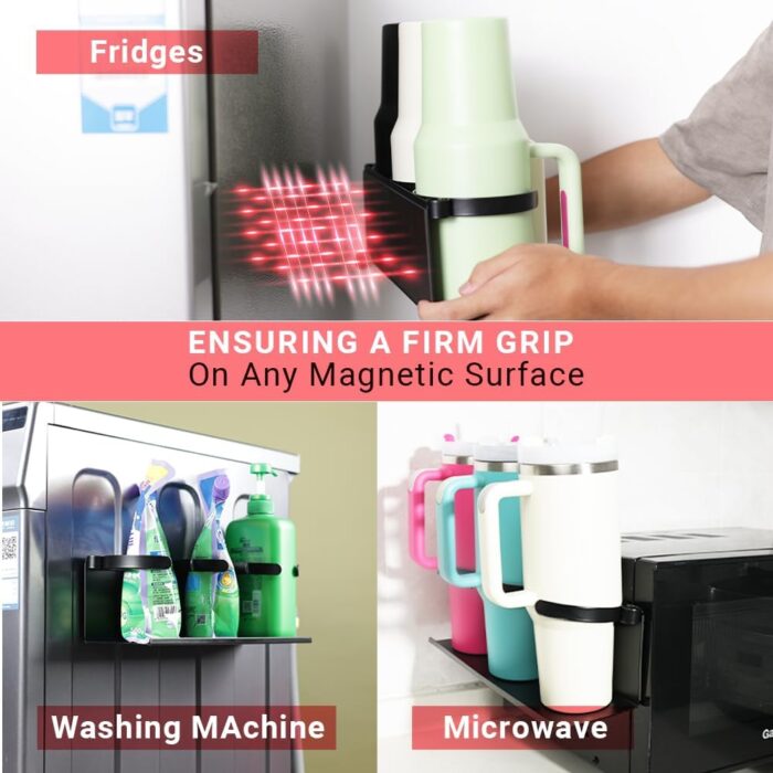 • Smart Storage, Clean Counters: Say goodbye to countertop clutter! This magnetic cup holder for fridge attaches easily to your fridge or any metal surface no tools, no hassle. Want to rearrange? Go for it! You can reposition your tumbler cups anytime to fit your kitchen’s vibe. It’s the effortless way to keep your space neat, tidy, and totally put together.